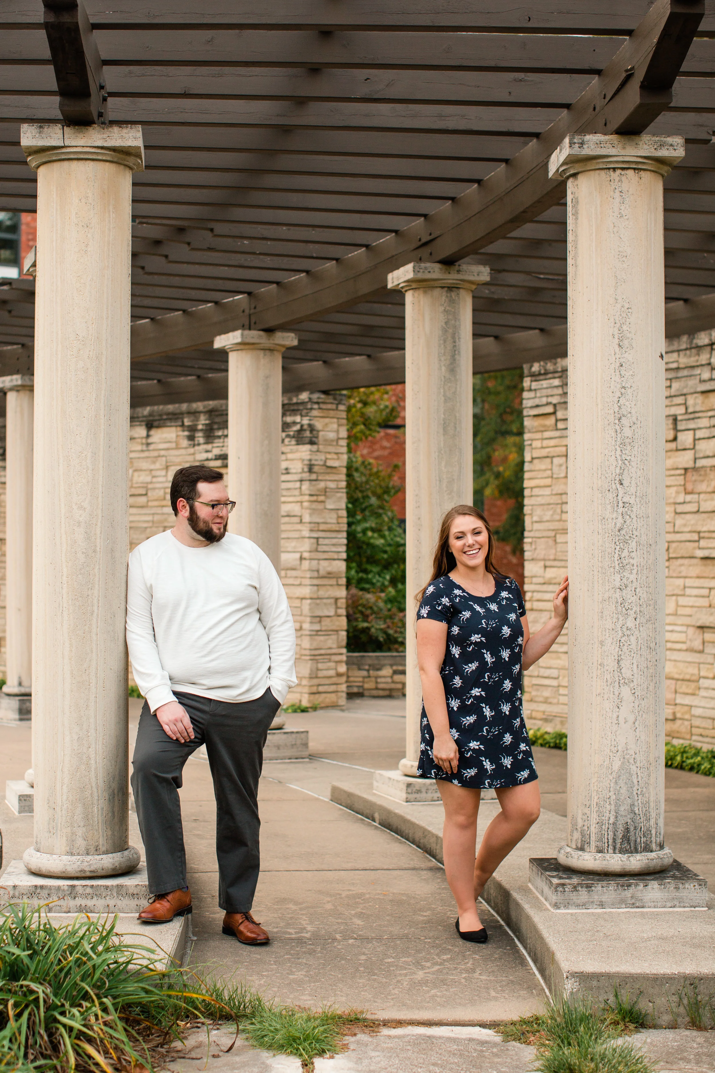 I had SUCH a blast hanging out with these two during their engagement session! Sean and Jess are so much fun. Not only did they bring their sweet (and enthusiastic) dog along for a few photos, but they showed me around Drake University! I’d been dying for a tour, since I live nearby, and as alumni, they happily agreed! I love getting to know new couples. These two work in the Des Moines area— Sean as a teacher, Jess as a manager at a local restaurant. They love sushi, traveling (Sean proposed while on a trip to New Orleans!) and fall— in fact, they’re getting married in October of 2019! What better than fall engagement photos to practice for fall wedding photos? :)